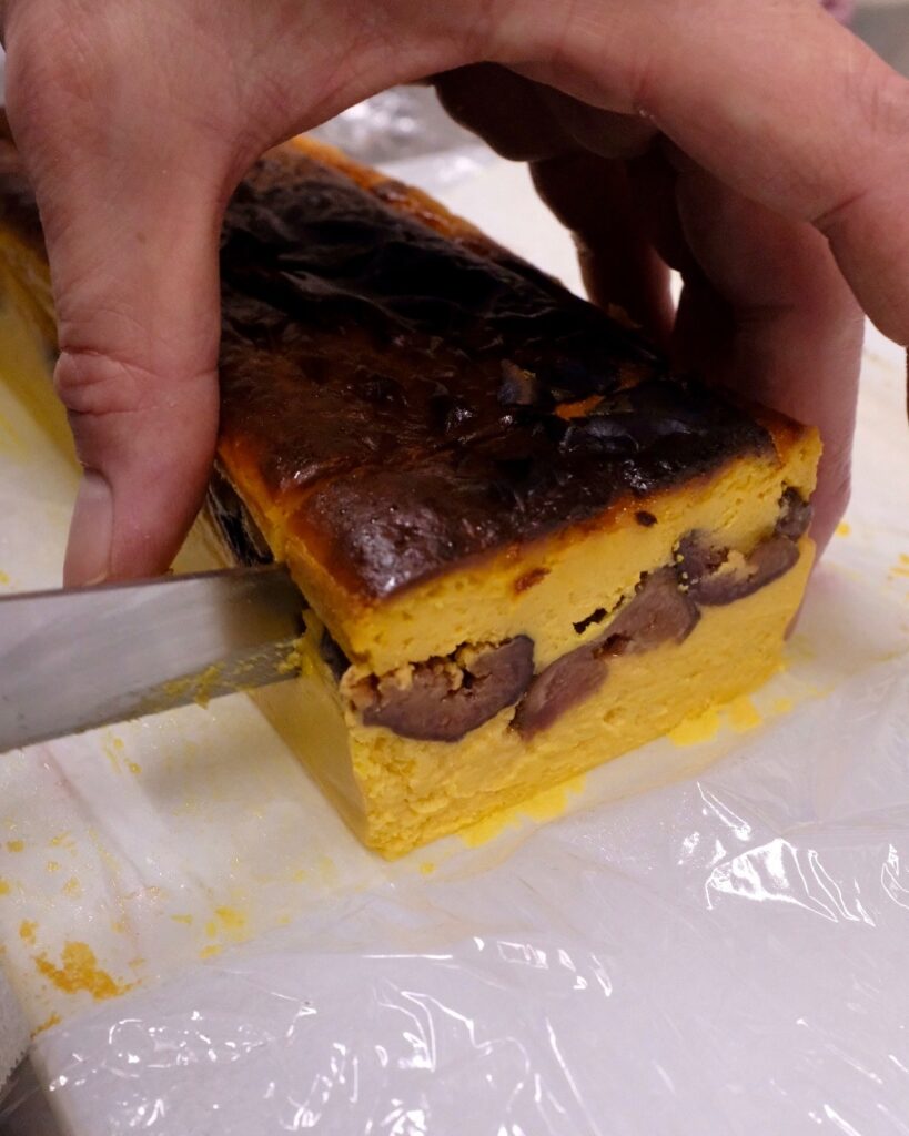 2時間程かけてセミドライにした向島産黒いちじくを中に忍ばせ、湯煎でしっとり焼き上げました。