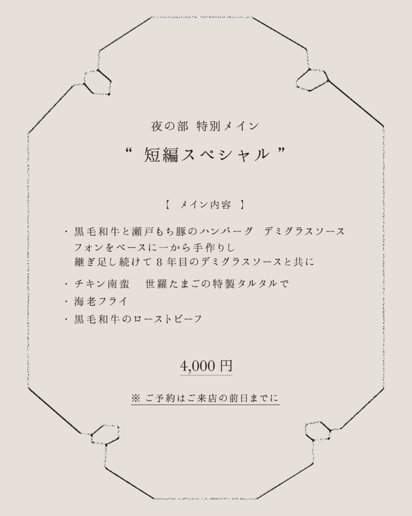 夜の部では、“短編スペシャル”を、予約制にてご用意しております(下記参照)。